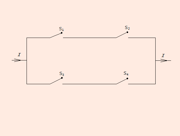 On considère le montage électrique suivant dans lequel les 4 switchs $S_1$ à $S_4$ peuvent être indépendamment fermés avec une probabilité p.